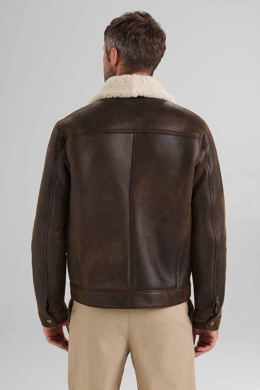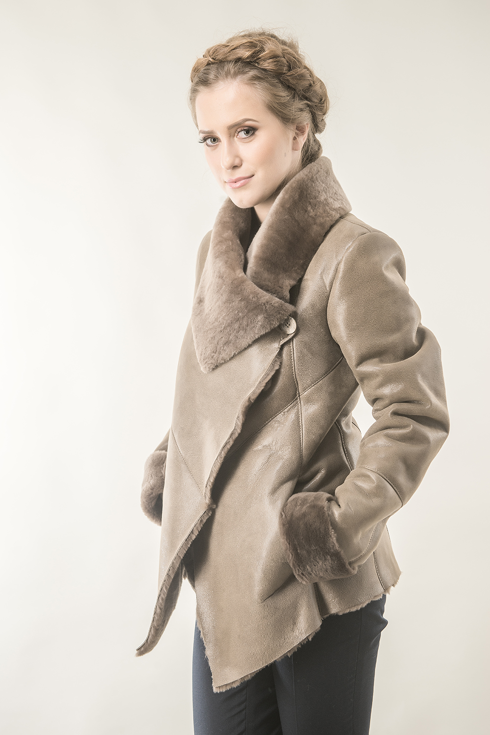 Această jachetă este confecționată la exterior din piele nappa de miel, de cea mai bună calitate, rezistentă la murdărie și umezeală, iar pe interior găsim blană naturală de miel tunsă cu perfecțiune la o grosime de 8 mm. Gulerul jachetei este realizat din blană naturală de miel, tunsă. Haina are 4 buzunare, două la piept, un detaliu practic, și două laterale, toate se închid cu fermoar.