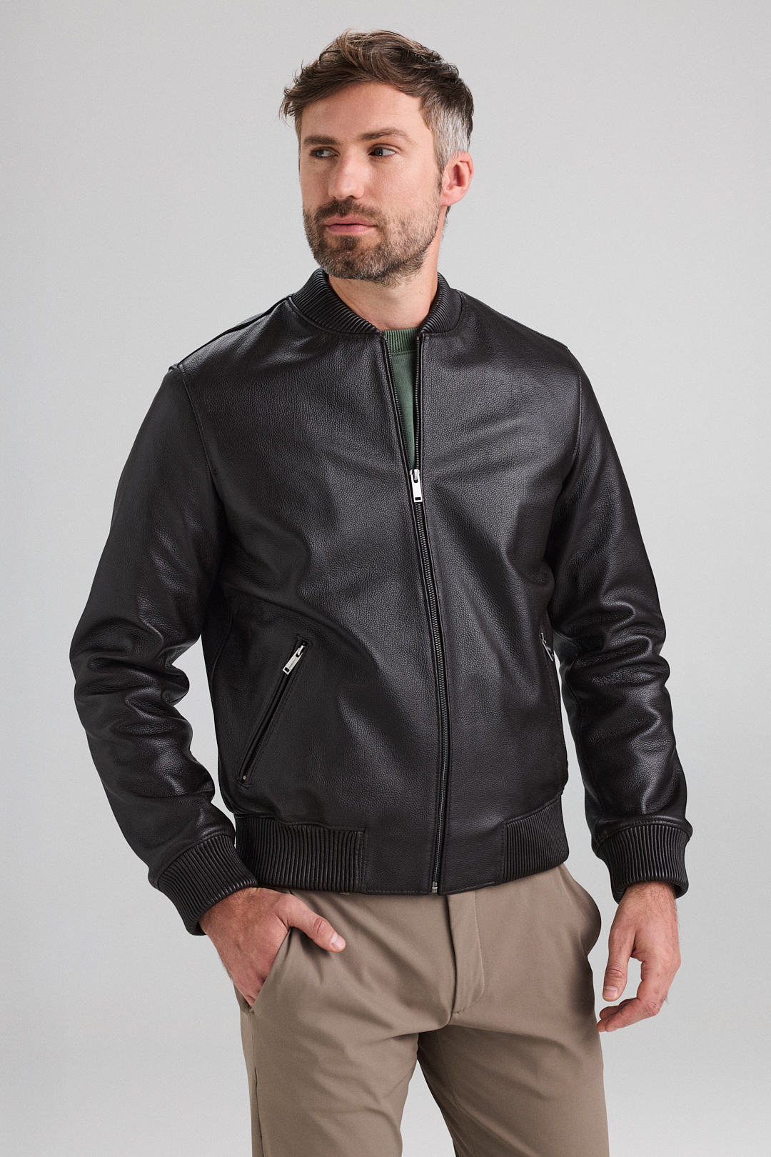 Gulerul și manșetele sunt confecționate din piele elastică, oferind confort și o fixare perfectă, fără a compromite liniile curate ale croiului. Cele două buzunare frontale cu fermoar sunt integrate discret, adăugând funcționalitate și stil.