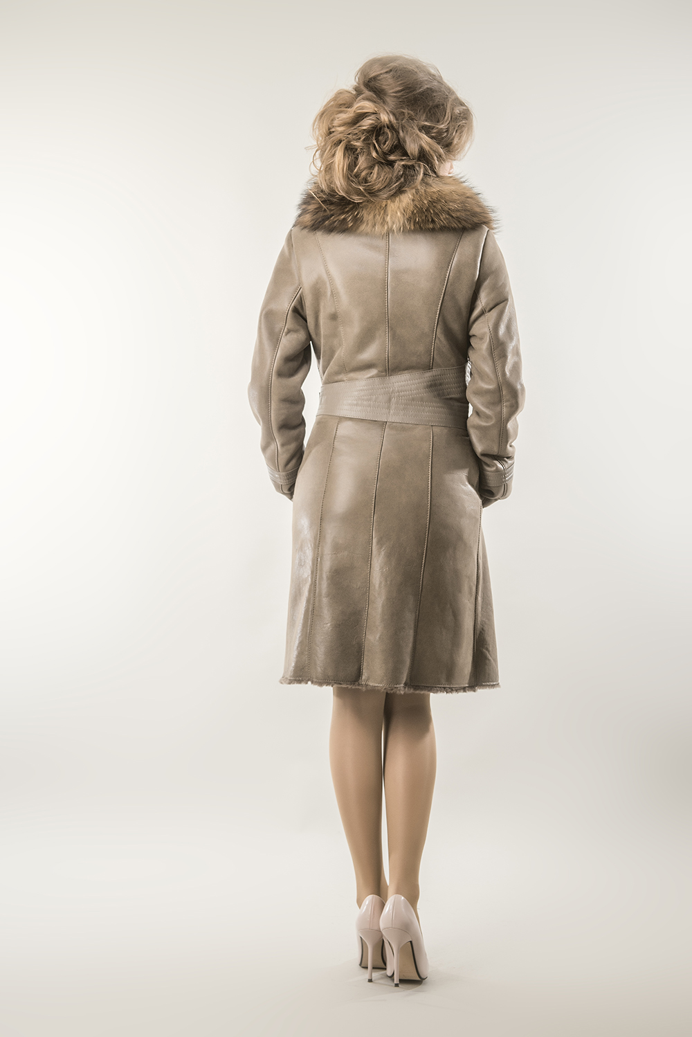 Această jachetă este confecționată din piele nappa de miel, cu rezistență la umezeală și murdărie, iar interiorul pieii este blană naturală de miel tunsă la o grosime de 8 mm. Gulerul jachetei este confecționat din blană naturală de miel, tunsă, iar ca și detaliu util are o cataramă ce se poate utiliza pentru închiderea gulerului. Jacheta are drept sistem de inchidere un fermoar, iar la bază sunt două capse. Buzunarele jachetei se închid cu fermoar. Manșetele au ca și detaliu capse, pentru un stil casual și modern.