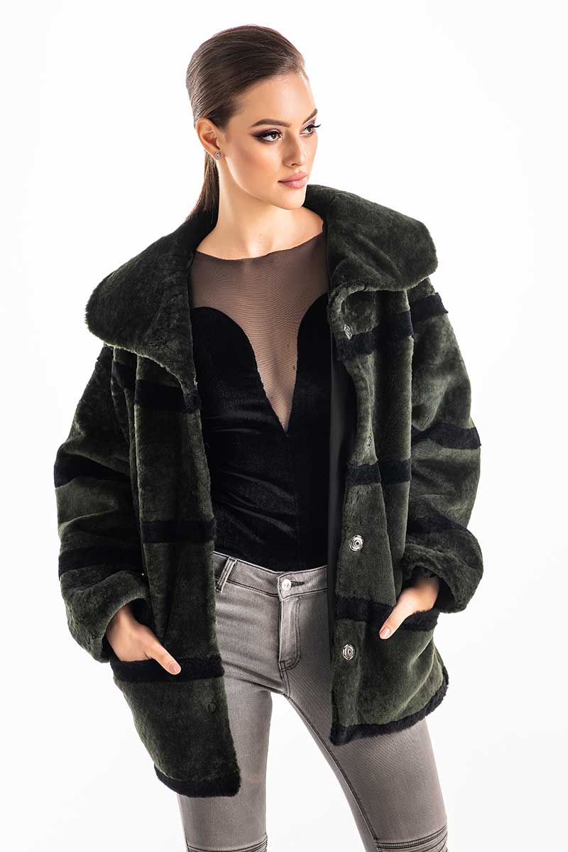Această haină de damă din blană de miel merinos este elegantă și potrivită pentru zilele friguroase. Partea din față și din spate este confecționată din blană tunsă de miel iar mânecile și partea laterală a hainei sunt confecționate din piele nappa de miel. Haina de blană are lungime medie și se închide cu capse. Mâinile sunt protejate de frig datorită celor două buzunare călduroase. Această haină de blană are o croială modernă, care scoate în evidență silueta. Lungimea medie a hainei asigură căldură și îi conferă lejeritate.