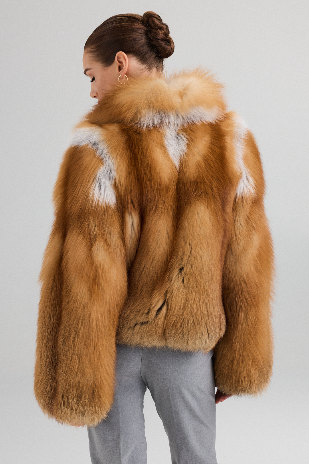 Tonurile calde, în nuanțe naturale de maro-ruginiu cu inserții albe, evidențiază caracterul autentic al vulpii canadiene, aducând un plus de eleganță oricărei ținute, fie că vorbim de o apariție de seară sau un look modern de zi.
